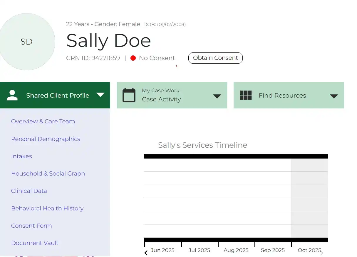 a. A message will display that indicates Consent has not been obtained at this time. Case work can be done, but the details of the Client’s Profile cannot be shared until Consent is obtained.